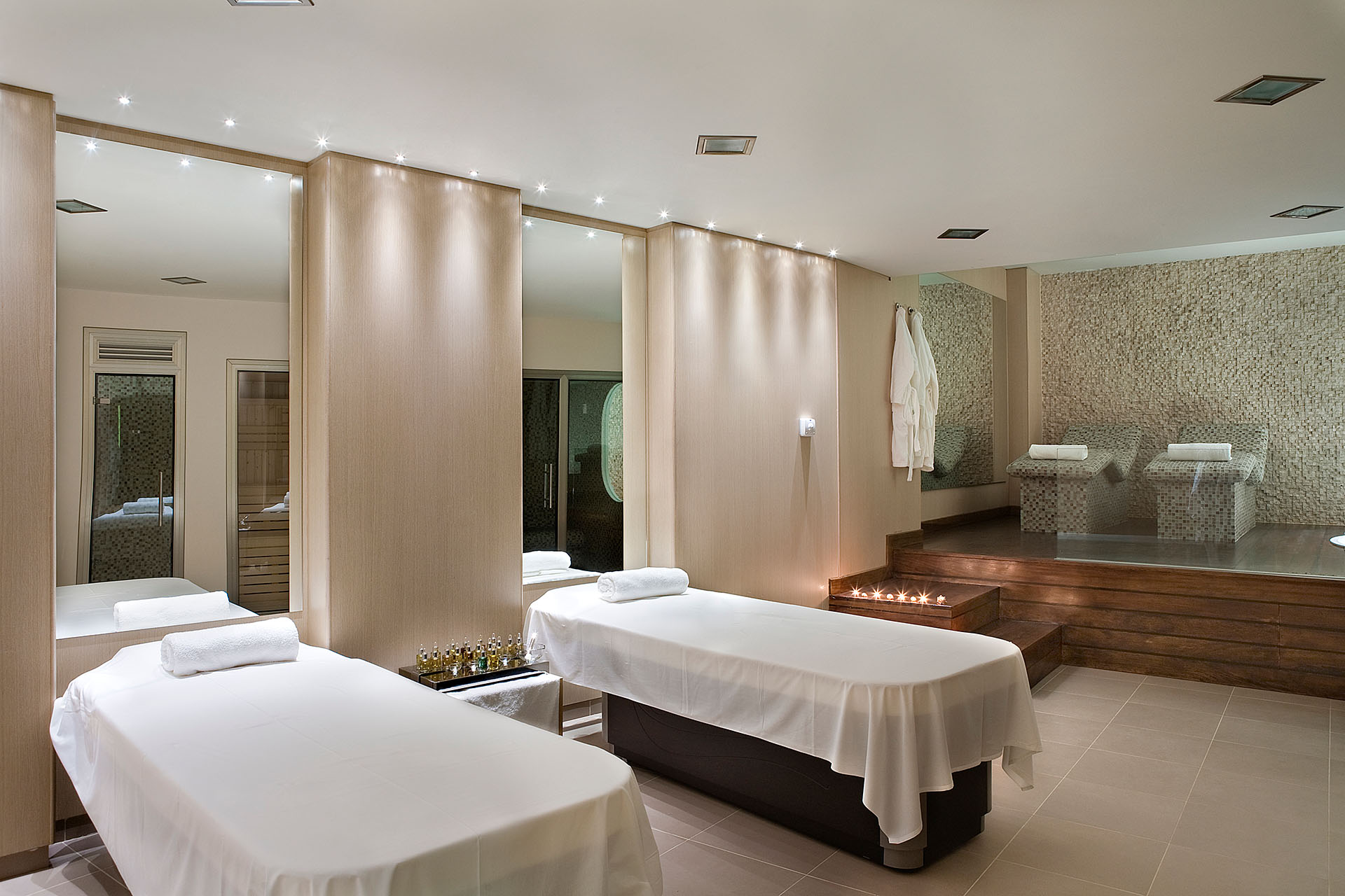 Οι επισκέπτες μπορούν να απολαύσουν ιδιωτικές θεραπείες σε δύο ειδικά κρεβάτια θεραπειών, ενώ τα αυτόνομα αποδυτήρια με όλες τις παροχές εξασφαλίζουν άνεση και διακριτικότητα σε κάθε στιγμή. Ο συνδυασμός του απαλού φωτισμού, των αρωμάτων και της ηρεμίας του χώρου δημιουργεί μια εμπειρία πραγματικής ευφορίας.